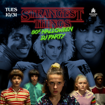 Strangest Things: 80s Halloween Party comes to Madame Lous on Halloween Night! Come dressed as your favorite Stranger Things characters for prize giveaways and all 80s Dance Music, all night long! Featuring DJ Dance Dance and Boy Band Tribute - #All4Doras