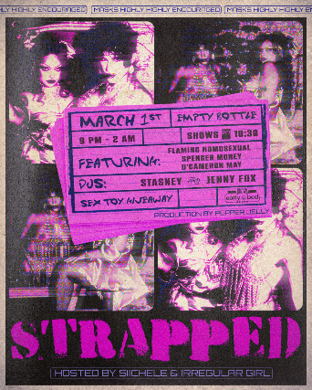 STRAPPED featuring Flaming Homosexual, Spencer Money & D'Cameron May. DJs Stasney and Jenny Fox. Hosted by Irregular Girl and Siichele.