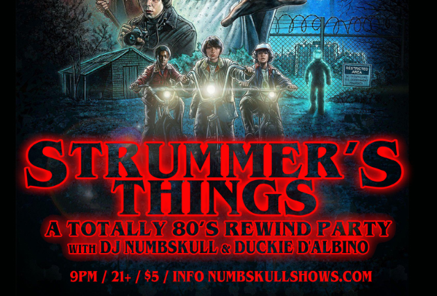 Our salute to all things 80s returns with a special STRANGER THINGS themed edition. Strummer's will be turned Upside Down. Costumes encouraged. DJ Numbskull & Duckie D'albino providing 80s aural & visual delights.