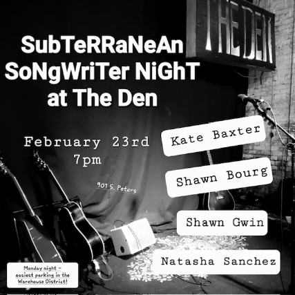 It's SubTeRRaNeAn SoNgWriTer NiGhT! The night will feature 4 amazing singer-songwriters local to New Orleans! We have a packed lineup with Shawn Gwin, Natasha Sanchez, Shawn Bourg and Kate Baxter! Join us for a night of quality music and great energy! No need to buy tickets, this is a FREE SHOW! Feel free to RSVP to save your spot!