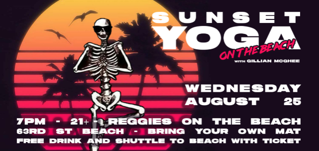 Join us at Reggies on the Beach (63rd St Beach) for a sunset yoga class with Gillian McGhee followed by drinks on the deck. Hang out on the deck after the class for a complimentary drink! Our food menu will be available too. All skill levels welcome! BRING YOUR OWN MAT!
