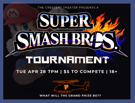 Join us at the Crescent Theater for an electrifying Super Smash Bros. Tournament where cinematic scale meets competitive chaos. Watch your favorite fighters clash in larger-than-life battles as players go head-to-head under the glow of the theater screen. Whether you’re a seasoned Smash veteran or just here for the hype, this is your chance to test your skills, cheer on the competition, and experience the game like never before!