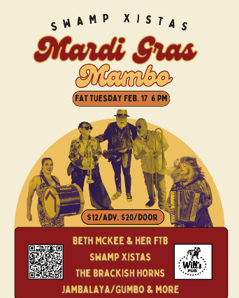 Celebrate Fat Tuesday at Will’s Pub with a Cajun-inspired, community-style Mardi Gras featuring performances from Beth McKee & Her Funky Time Band and the Swamp Xistas, parade energy, and a playful take on the Chicken Chase. We’re planning a spread of homemade Cajun favorites (with a vegan-friendly option) and King Cake, shared while supplies last — all benefiting Swamp Sistas La La Foundation, Inc.’s 2026 programs, including community music projects and monthly collaborative gatherings that give back locally.