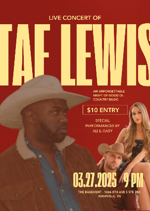 North Carolina native Tae Lewis, Influenced by Rascal Flatts, Eddie Rabbitt, and Vince Gill, who have all helped shape his distinct sound, making him a true standout in the music scene.His breakthrough came with a Sync Placement on the hit TV show "Shameless" for his track "Good Luvin," earning him national recognition. In the Summer of 2023, Tae was also named the Tractor Supply Emerging Artist of the year, receiving mentorship from country music superstars Lauren Alaina and Lainey Wilson.He is also recognized on Season 25 of THE VOICE placing as Top 9 for his season.
