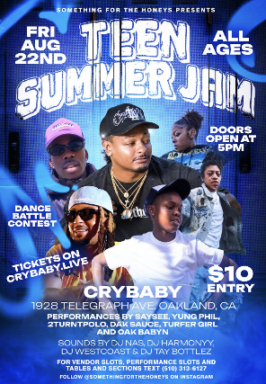 Teen Summer Jam is swinging through Crybaby to pop off something special with Beats and Dance Battles. Some of the Bay Area's best DJs and Dancers will be on deck to bring the energy. Not something to miss!