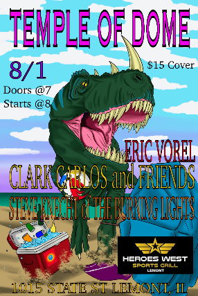 Temple of Dome, Eric Vorel, Clark Carlos and Friends & Steve Knecht of the Burning Lights are performing on Friday, August 1st at Heroes West in Lemont. Come early for dinner and stay for the show! This is a 21+ Event