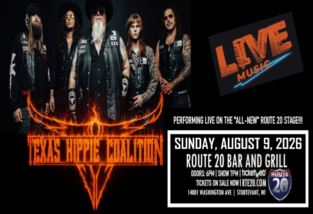 Route 20 Bar And Grill presents "TEXAS HIPPIE COALITION" on Sunday, August 9, 2026.