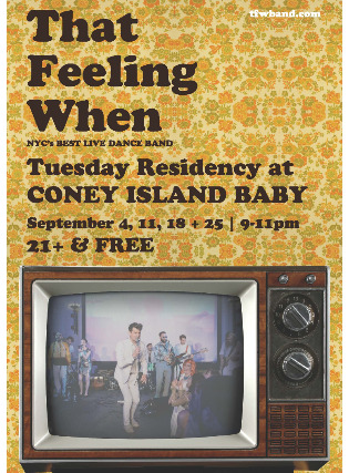 That Feeling When (TFW) is NYC’s #1 musical throwback experience. They cover everything from Bowie and Blondie to dance classics like Tears for Fears and Talking Heads. After performing in front of 2K people at the Brooklyn Museum’s “Night of 1,000 Bowies”, the band is on fire. :)
