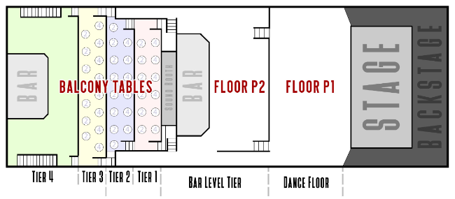 Tables are assigned and labeled based upon time of purchase and are located in our four-tiered balcony (stair access only).