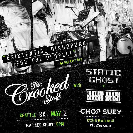 Fans say The Crooked Stuff’s complex sonic formula consistently delivers an undeniable, energizing live-show reaction. One called it “like INXS injected into The Prodigy.” Another said, “It’s somewhere between Gorillaz, Daft Punk, and TV on the Radio.” Someone else described it as “Johnny Rotten hijacking LCD Soundsystem and throwing Herbie Hancock on synths.” All agreed—they were feeling it!