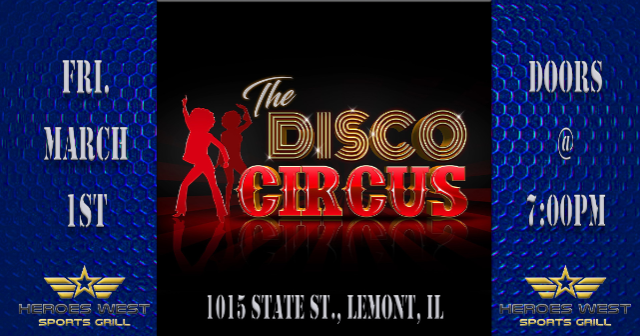 The Disco Circus is performing on Friday, March 1st at Heroes West in Lemont. Come early for dinner and stay for the show! This is a 21+ Event