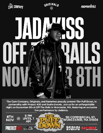 The Cure Company, Originals, and Nameless proudly present The Puff Down, in partnership with Project 420 and Seshn Events. Join us for an unforgettable night on November 8th at Off The Rails in Worcester, MA, featuring an exclusive live performance by Jadakiss. Opening sets by Dj Stenny and Bake Joynton