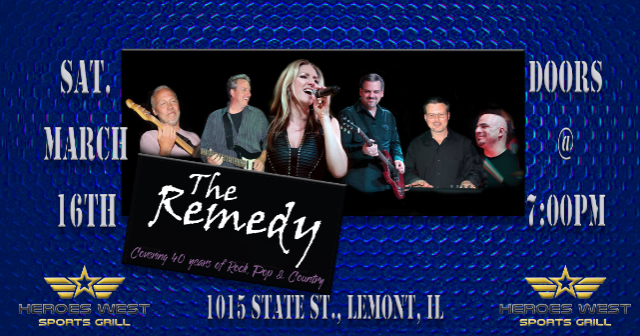 The Remedy is performing on Saturday, March 16th at Heroes West in Lemont. Come early for dinner and stay for the show! This is a 21+ Event