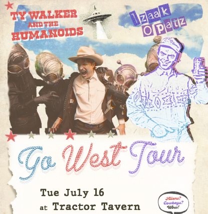 Their live shows are something of a cosmic spectacle, featuring the large-headed, buggy-eyed aliens themselves adorned in matching black western wear, a pedal-steel playing android, and Ty, as the perhaps reluctant cowpoke frontman who leads the audience through an otherworldly set. The show is a multimedia experience with sci-fi elements and often includes a tin foil hat contest for attendees to join in.
