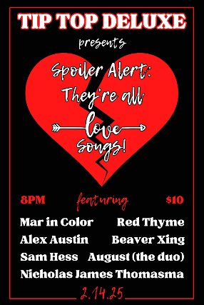 A special Valentine's Day show featuring~ Nicholas James Thomasma, Mar in Color, Red Thyme, August (the duo), Alex Austin, Sam Hess, Beaver Crossing