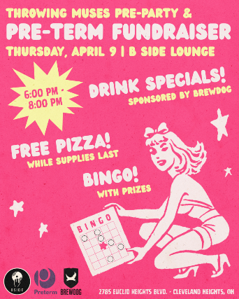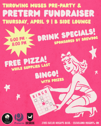 Before the Throwing Muses w/ Non Bruises concert LIVE at Grog Shop, stop down to B Side Lounge for a cold one and FREE PIZZA while supplies last! Enjoy pizza, snacks, drink specials sponsored by Brewdog and bingo (with prizes!) while raising funds for Preterm!