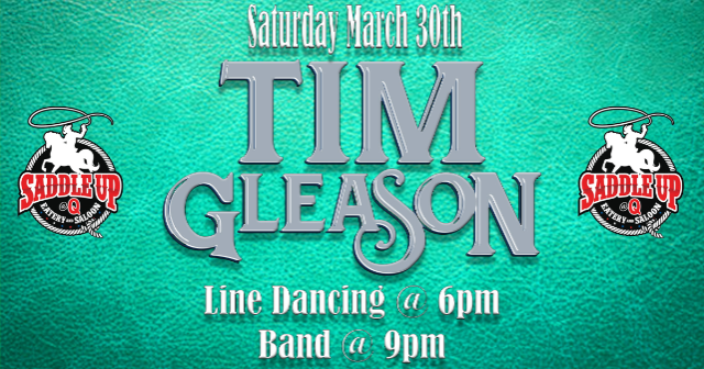 Join us on Saturday, March 30th when The Tim Gleason Band performs at Saddle Up @ Q. Line dance lessons start at 6pm and the band takes the stage at 9pm.