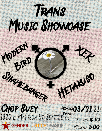 Trans Music Showcase featuring Shame BangerXEKModern Bird, and Hetakuso with a portion of proceeds going to Gender Justice League on Saturday, March 21st