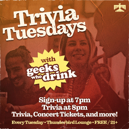 Geeks Who Drink brings the nations best live hosted pub quiz to Thunderbird Lounge every Tuesday! Join us for 7 rounds of audio, visual and live hosted trivia. Our weekly quiz is free to play and well be giving away prizes for answering bonus questions and gift cards for our top teams at the end of the night. Geeks Who Drink rules limit the total number of players on your team to 6, so gather your smartest friends and come down.