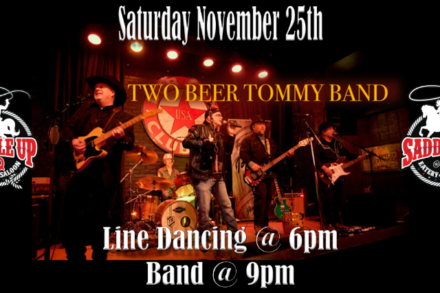 Join us on Saturday, November 25th when Two Beer Tommy performs at Saddle Up @ Q. Line dance lessons start at 6pm and the band takes the stage at 9pm.
