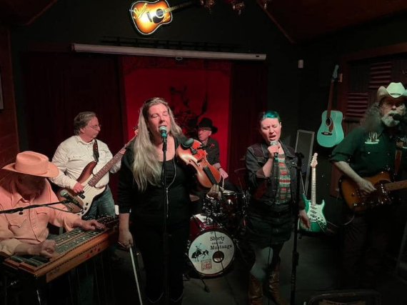 Shorty & the Mustangs play a mix of western swing, honky tonk and roots country music. Lara Carlisle's heart felt singing can get folks out on the dance floor with a Patsy Cline torch song or a Gram Parsons rocker. Ken Woodside and Phil Hornik, on drums and bass, lay down a strong dance beat while Mike Moore on guitar, and Mitch ‘Big Tex’ Gilbert on steel guitar put in the twang and tears. Marilee Hord sings beautiful duets with Lara and plays the heck out of the fiddle.