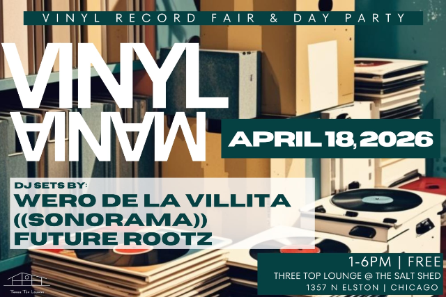 Join us at Three Top Lounge at The Salt Shed for a free vinyl record fair and DJ day party featuring DJ El Wero de la Villita, Sonorama DJs, and Future Rootz DJs. Browse local vinyl record vendors offering records in all styles while enjoying a vibrant daytime soundtrack of eclectic selections, deep cuts, and dancefloor-ready sounds. Whether you are crate-digging for hidden gems or just coming to soak in the music and atmosphere, this is a celebration of vinyl culture, community, and great DJs in one of Chicago’s best spaces.