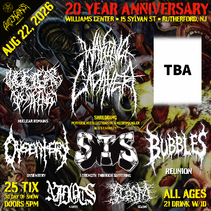 WAKING THE CADAVER 20 YEAR ANNIVERSARY SHOW FEATURING: NUCLEAR REMAINS, DYSENTERY STRENGTH, THROUGH SUFFERING, BUBBLES (REUNION), NJDOTS AND SCASM