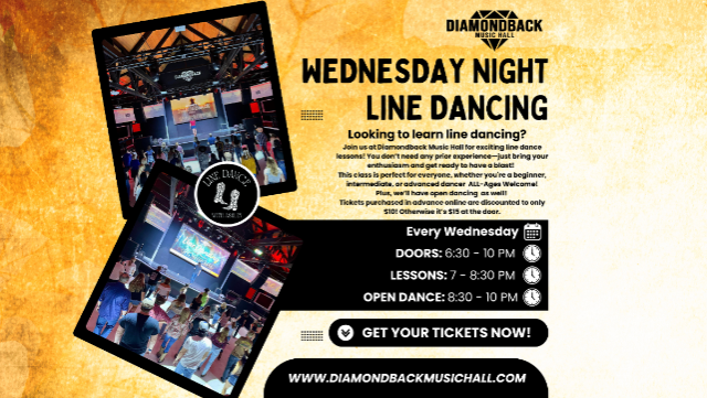 Join us at Diamondback Music Hall for exciting line dance lessons! You don’t need any prior experience—just bring your enthusiasm and get ready to have a blast!