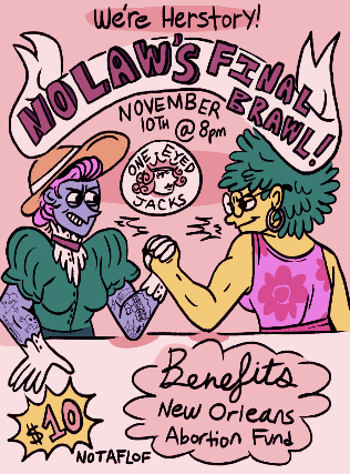 For nearly a decade, NO LAW has raised thousands of dollars for incredible local organizations and put on fantastic shows, creating a far reaching queer and lady centered community. Let this be our final call to arms! Grab your picket signs and light your torches because well behaved women rarely make herstory!  It's the end of an era. Are you satisfied with your grip?!  Proceeds benefit the New Orleans Abortion Fund, Inc., "an organization rooted in social justice, with the purpose of challenging inequalities of class, gender, race and immigrant status by providing financial help to women who cannot afford the full cost of an abortion. We affirm a woman's right to control her body and her destiny, and work to ensure that all women have access to quality medical care, regardless of their economic situation." Join NO LAW for one last night of exhilarating ladies arm wrestling, eye-popping drag/burlesque/stripping, and dazzling celebrity guest judges. DJ Lunch$Money will keep you moving all night long in addition to performances by: Kat $natch Napoleon Complex Squirt Reynolds Woody Schitcks and MANY more! Venue is 18+. $10, NOTAFLOF. Gender neutral bathrooms. Accessibility note: three stairs to get from front bar to dance floor.  As per usual, ruthless wrestlers are lined up to fight for power, glory and affection. Your bets and cover support local women's organizations and could win you bar tabs, gift certificates or sweet NO LAW swag. Bring small bills for betting and bribing. Come for the drinks and ladies, stay for the smackdown.