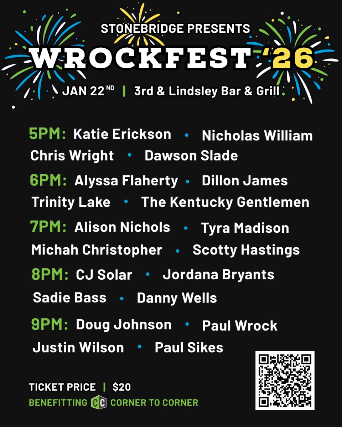 Wrockfest 2026: 20 artists, 5 hours, & 1 amazing cause. Come out on Thursday, 1/22, to Third & Lindsley for an amazing night of music. Hear the songwriters behind hits like “Check Yes Or No,” “Three Wooden Crosses,” “Drunk Me,” and many more. Rising stars from labels like Broken Bow Records, Integrity Music, & Black River will be playing as well!! Tickets are available on this link & at the door!! Don’t miss this unforgettable night!!