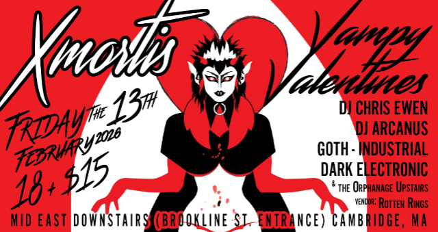The Middle East presents: Xmortis Vampy Valentines ~A Vampiric Valentines Party For those that love what the heart has to offer~ Goth, Industrial, dark Electronic with DJ Chris Ewen & DJ Arcanus ~ Friday the 13th of February!