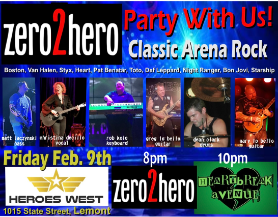 Zero2Hero and Heartbreak Avenue are performing on Friday, February 9th at Heroes West in Lemont. Come early for dinner and stay for the show! This is a 21+ Event